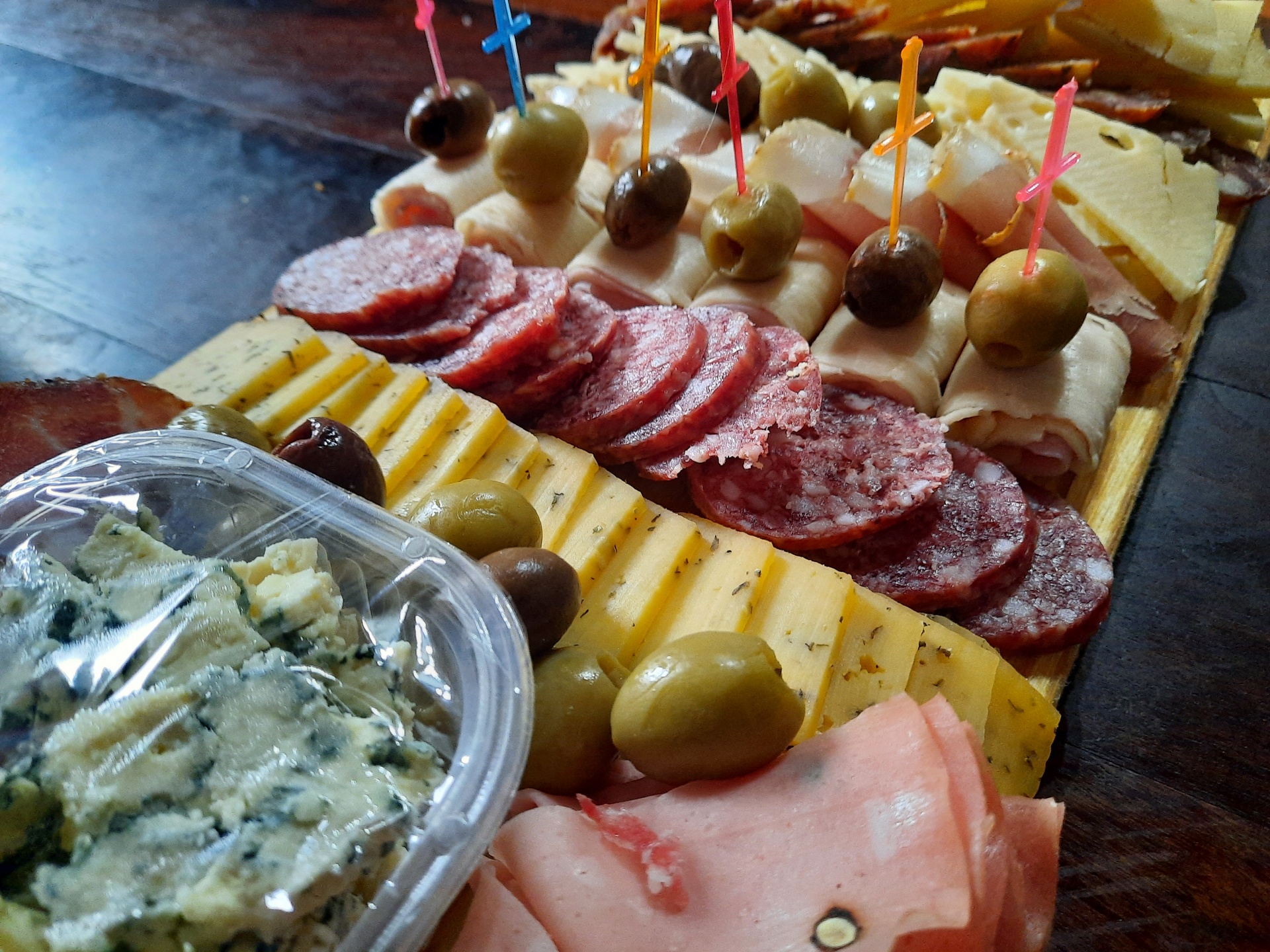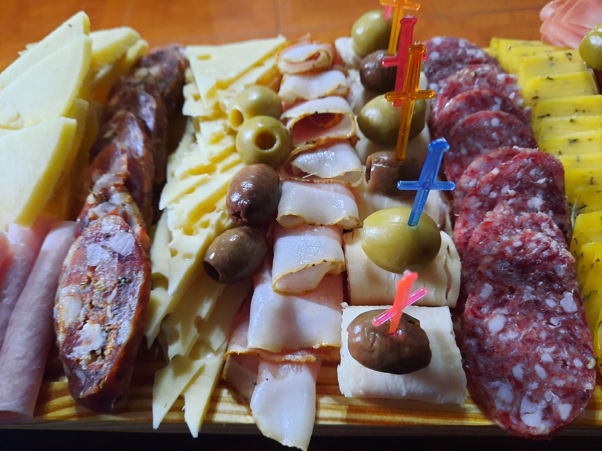 8 Fiambres (Mortadela Bocha, Salamín Picado Fino, Jamón Cocido, Salame Milán, Longaniza de Campo, Bondiola de Campo, Chorizo Seco de Campo, Jamón Crudo de Campo de Mercedes), 4 Quesos (Queso de Campo de Mercedes, Queso Saborizado de Tandil, Queso Pategras, Queso Azul), Aceitunas Verdes y Negras Descarozadas, Bocadito Cherry.